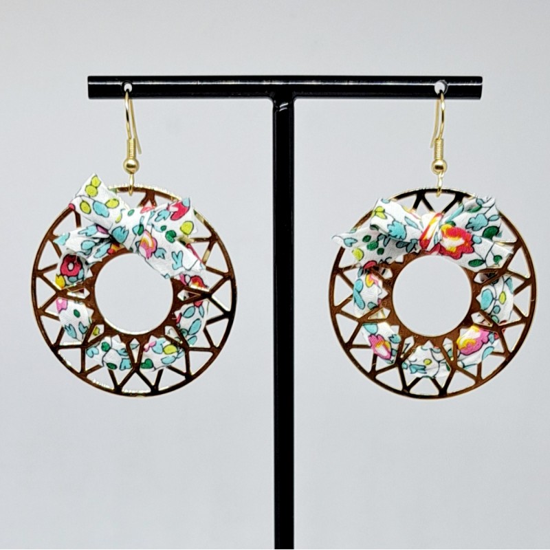 Boucles d'oreille sur estampe rosace dorée, nœud en Liberty en haut ou en bas.