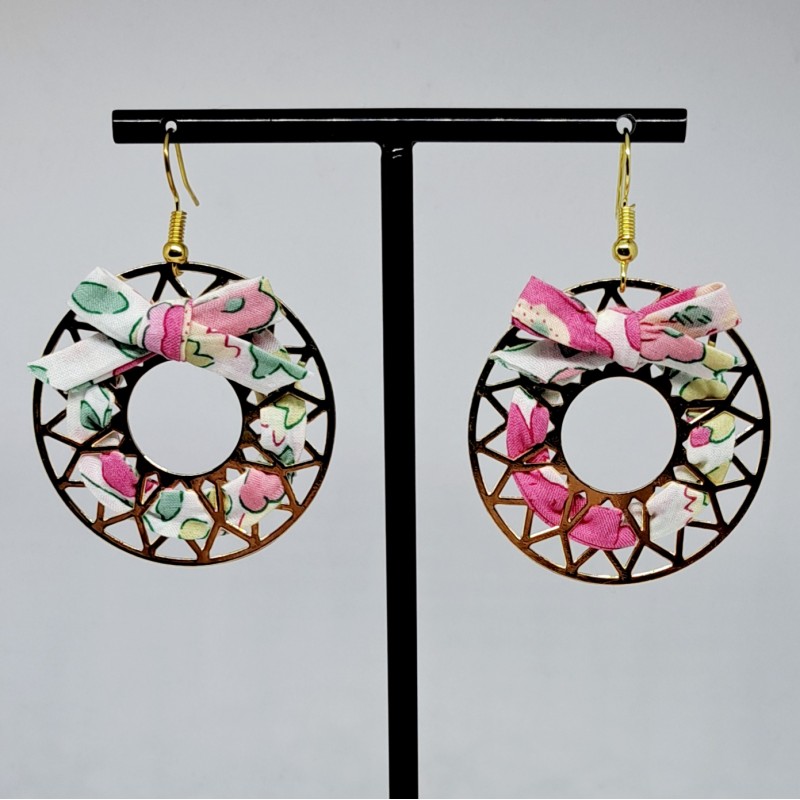 Boucles d'oreille sur estampe rosace dorée, nœud en Liberty en haut ou en bas.