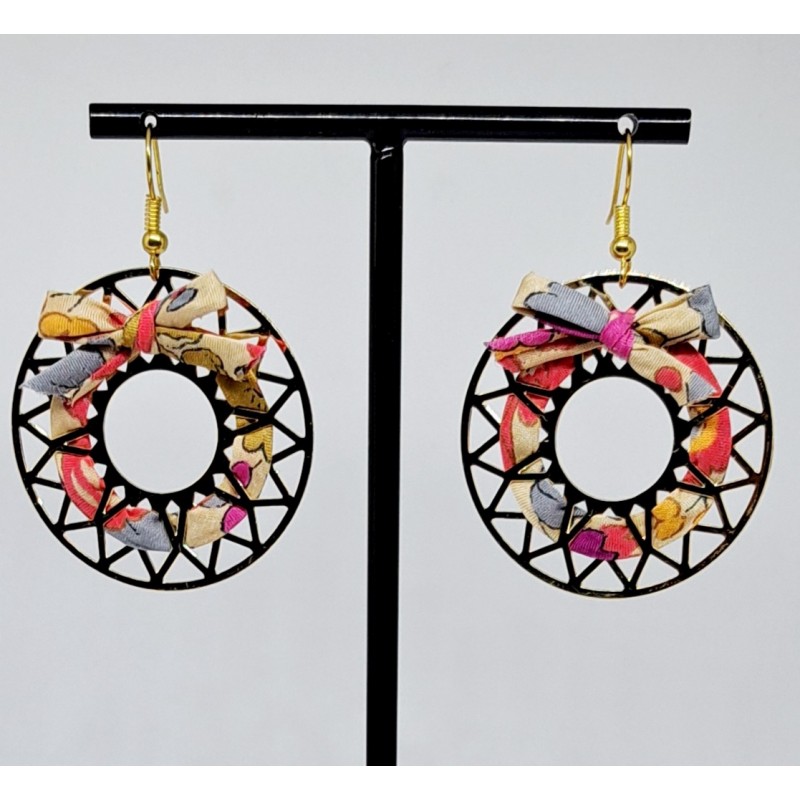 Boucles d'oreille sur estampe rosace dorée, nœud en Liberty en haut ou en bas.