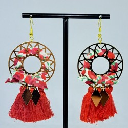 Une estampe dorée et son lien en Liberty, 3 pompons relevés par des sequins losanges dorés.
